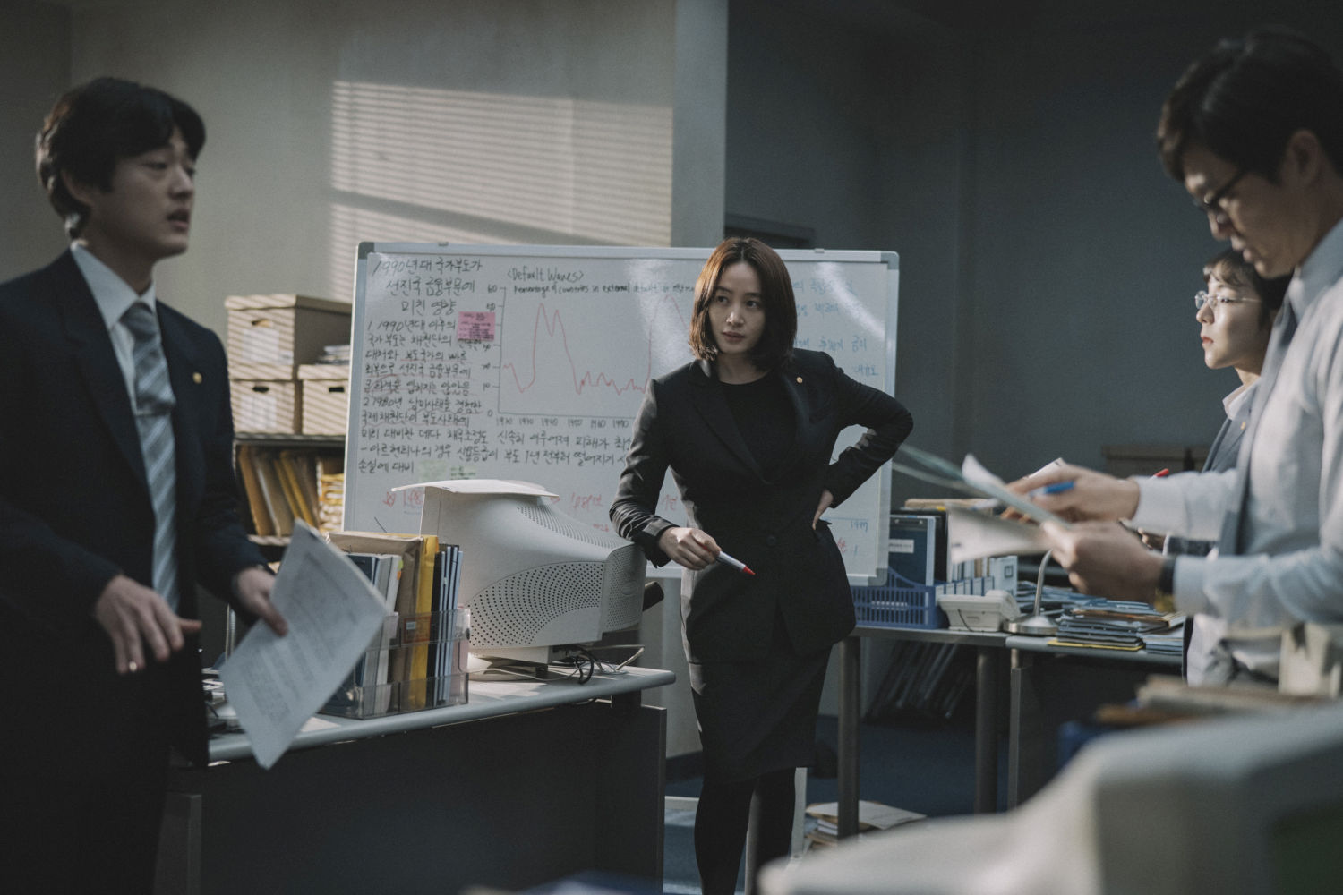 Il terzo protagonista è un’analista della Banca di Corea, interpretata con grande intensità dalla brillante Kim Hye-soo. Il suo personaggio comprende meglio di chiunque altro la profondità della crisi e ciò che è necessario fare per limitarne i danni. Le sue proposte piene di buon senso vengono però rifiutate dagli esperti del governo, che sembrano molto più interessati a scaricare la colpa su qualcuno che a proteggere la gente comune. Dopo che l’economia ha cominciato ad avviarsi lungo un’inarrestabile spirale verso il disastro, lei è testimone diretto dei negoziati tra il ministero delle finanze coreano e il capo del Fondo Monetario Internazionale, interpretato con untuosa arroganza dall’apprezzato attore francese Vincent Cassel.