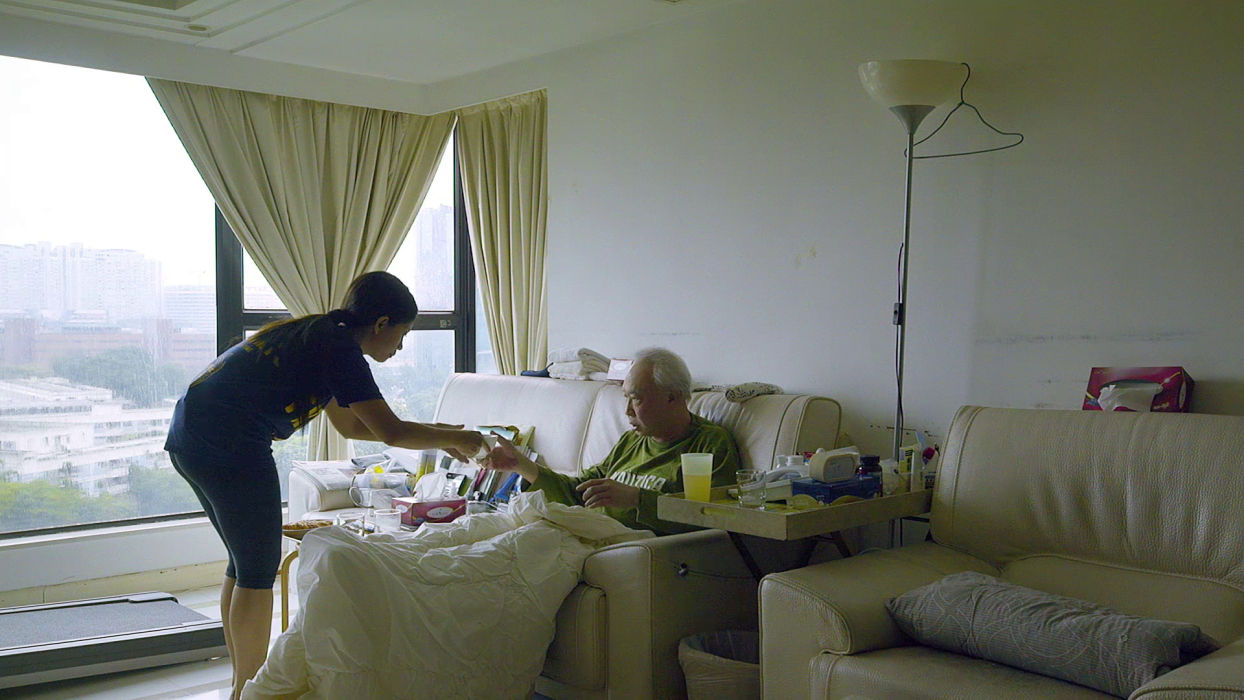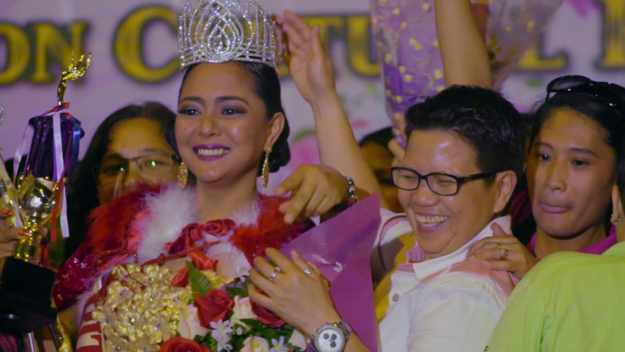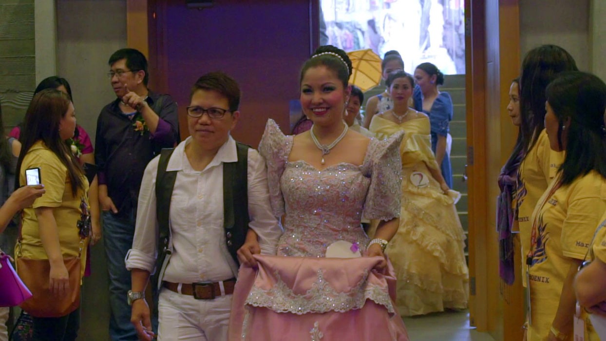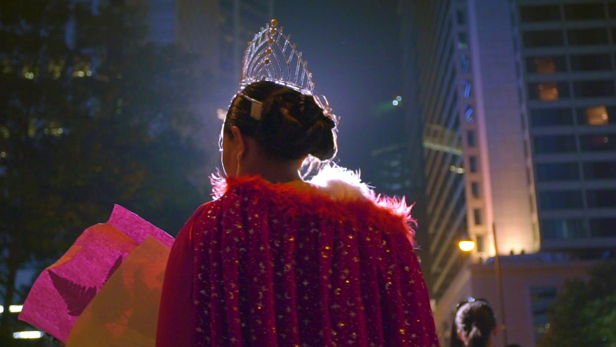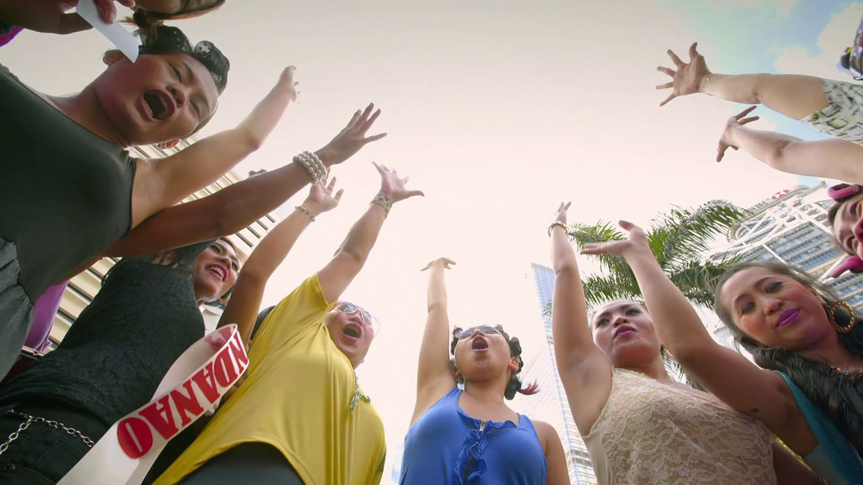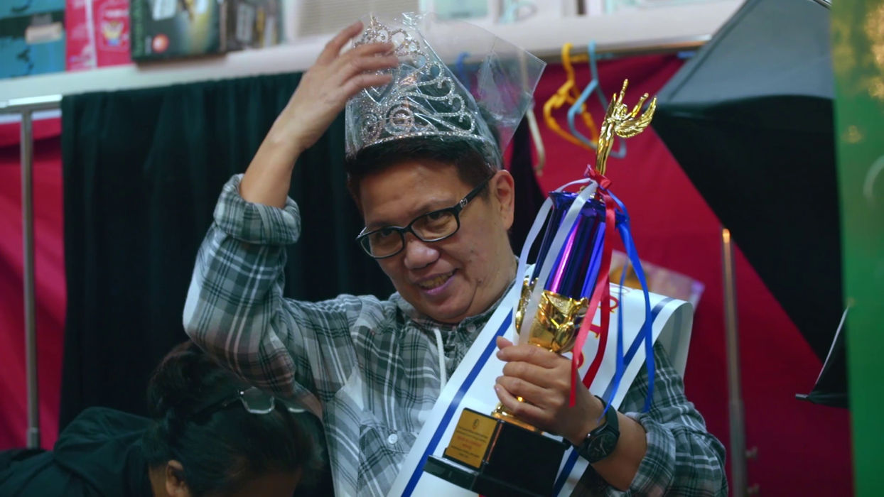 Rudelie’s ill-fated night is exemplary of Overseas Filipino Worker (OFW) life, where the harsh, thankless realities of domestic labor are interrupted by only momentary glimpses of play and fantasy. Baby Ruth Villarama’s loving Sunday Beauty Queen captures OFWs at work and during that one day of the week they get off, when, as any Hong Konger can attest, the women congregate in the streets to commune, crack jokes, celebrate birthdays, and even throw beauty pageants. At the head of the table is the smiling Leo, a queer godfather of sorts with a knack for solving problems, mounting events, and bringing people together.