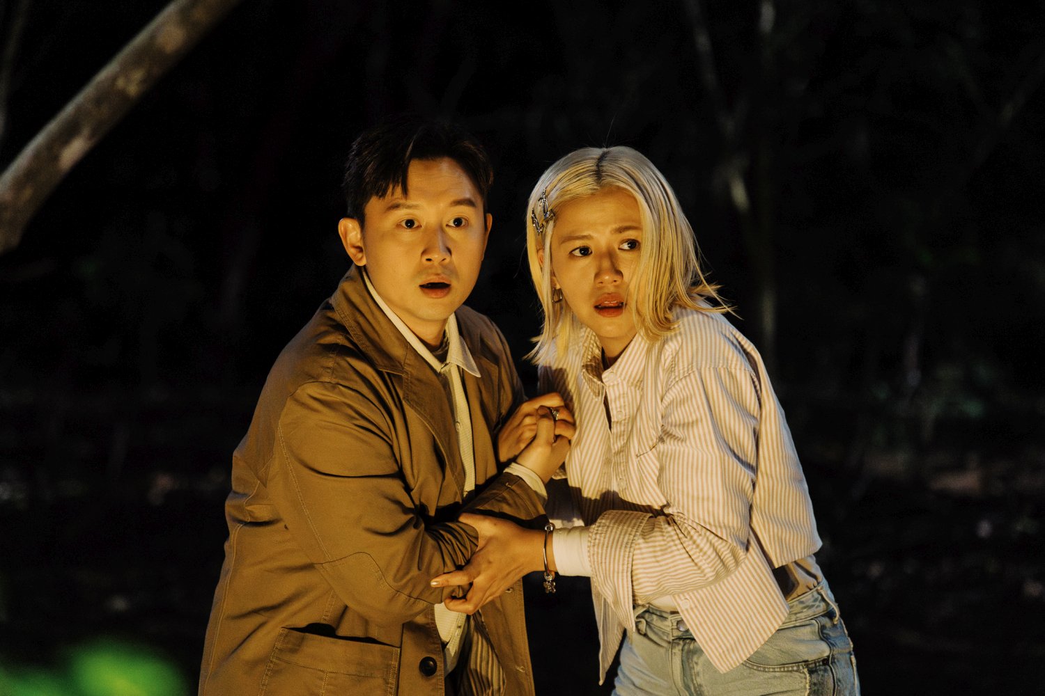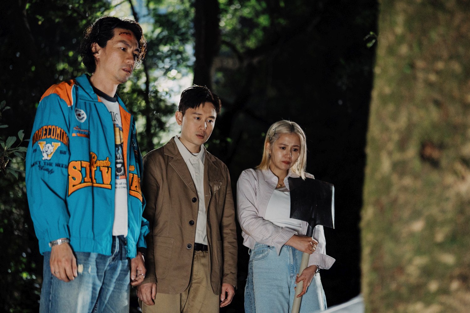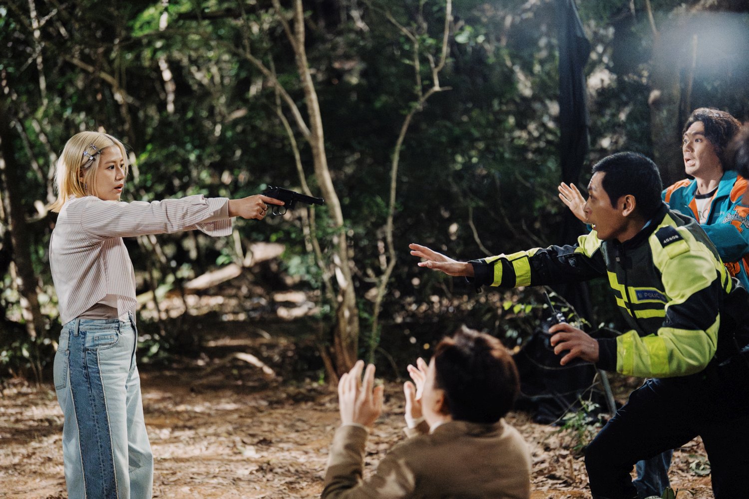 However, I should at least reveal the setup: To prank her boyfriend Mark (Ling Man-lung), vapid influencer Man (Renci Yeung) hires professional actor Kim (Peter Chan) to pose as Mark’s long-lost childhood friend, who supposedly went missing after being kidnapped by aliens many years ago. While watching the “reunion” from afar, she witnesses Mark and his best friend Kit (Ronald Lam) murder Kim, setting off a cat-and-mouse chase in the woods.